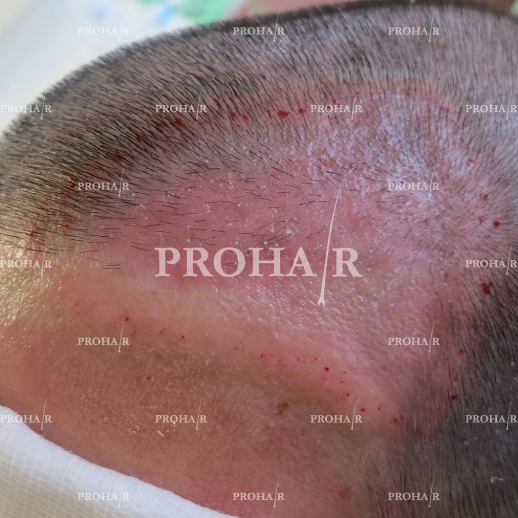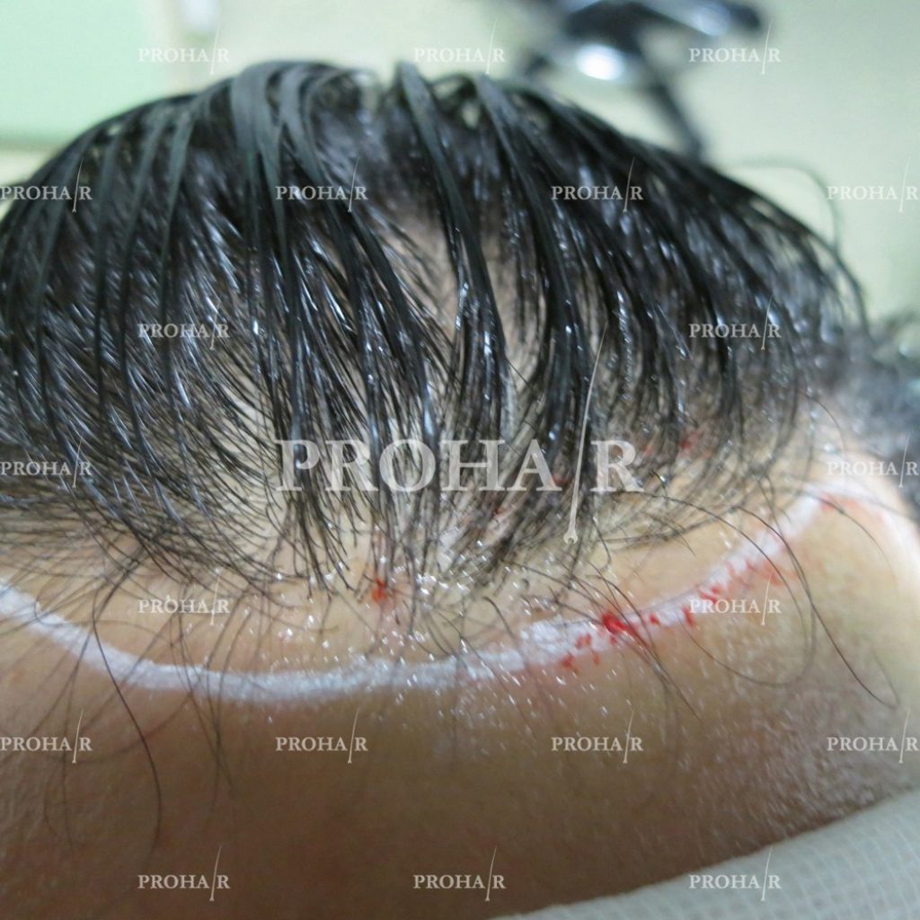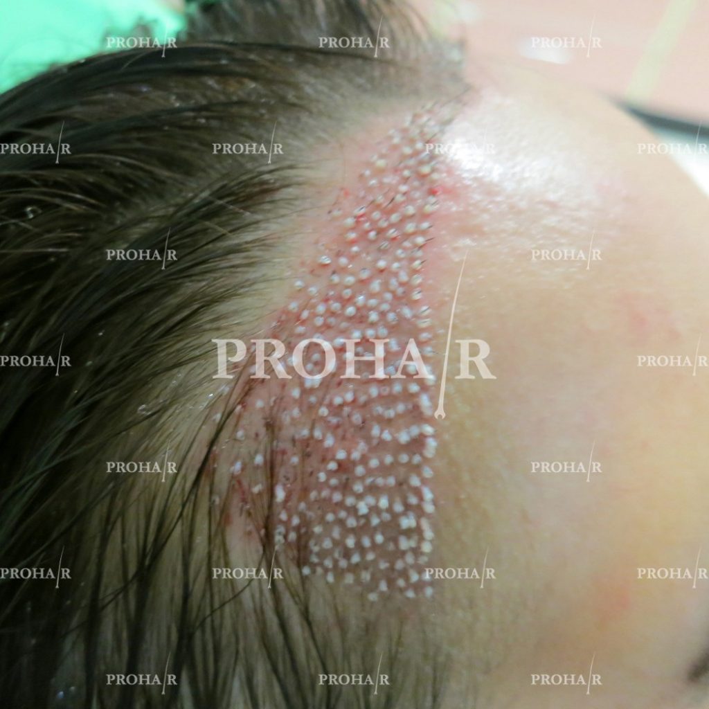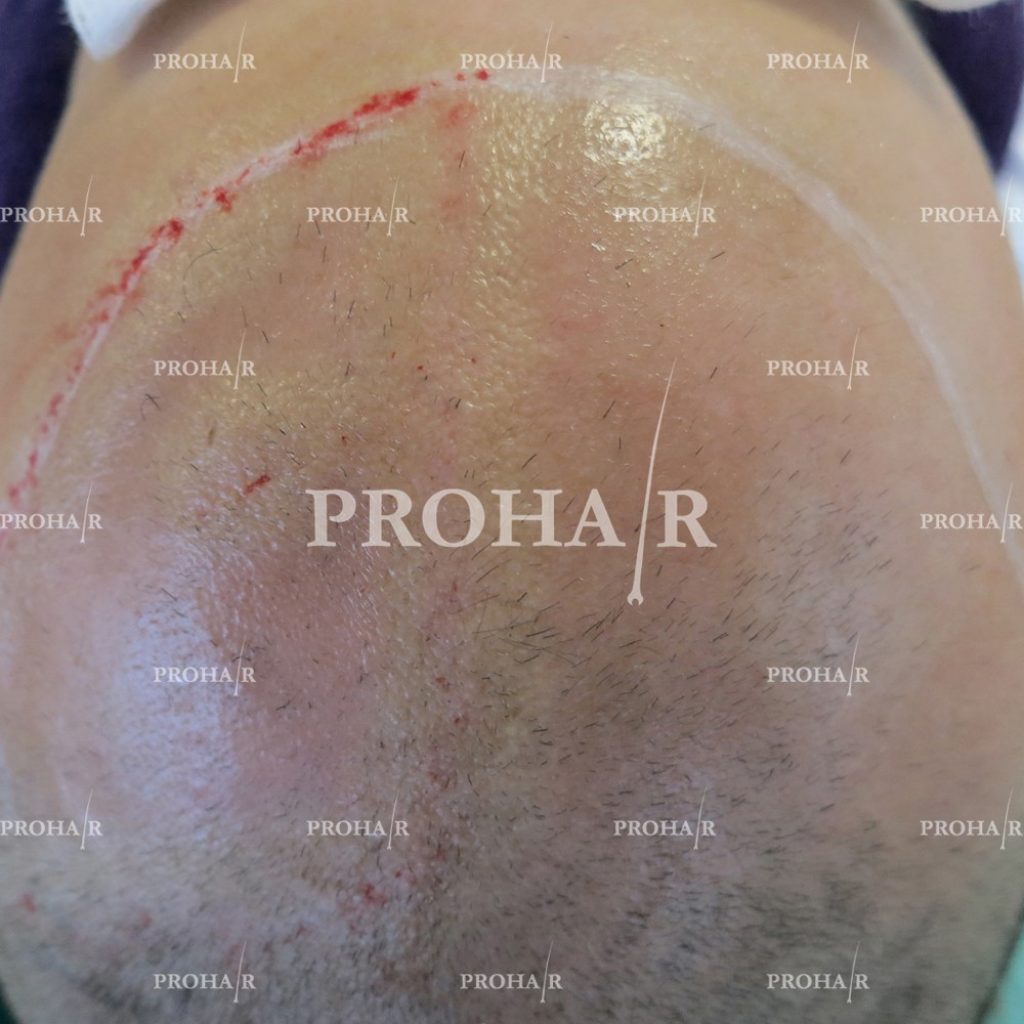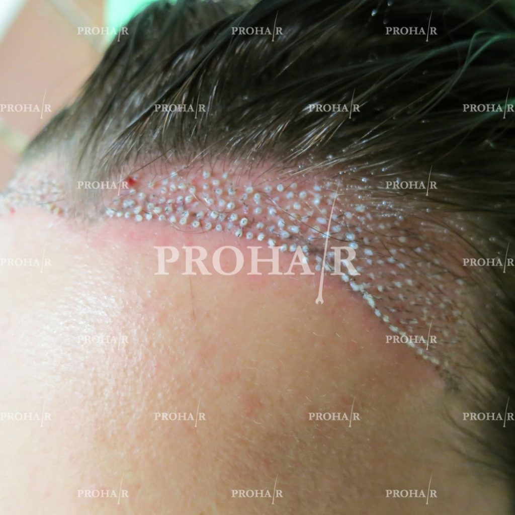 The hair is shaved (2mm) in the donor area and if the doctor can see the patient's skin. The FUE is removed with a small medical instrument which is a round punch (0.8 mm - 1.0 mm) via a complex process. After the anesthesia, an acute puncture is applied to the skin tissue surrounding the follicular units. It is not always possible to hit the direction of the hair under the skin, so the hair that is cut remains in the donor area and will grow after a few weeks. If the punch is successful, the graft is pulled up with tweezers and a small hole remains which heals after a few days without any visible scaring. In the case of the automated FUE technique, the small holes will leave white dots that is scarring and will remain for life. If the surgeon works manually, as in the PROHAIR CLINIC it will look nothing after a week.